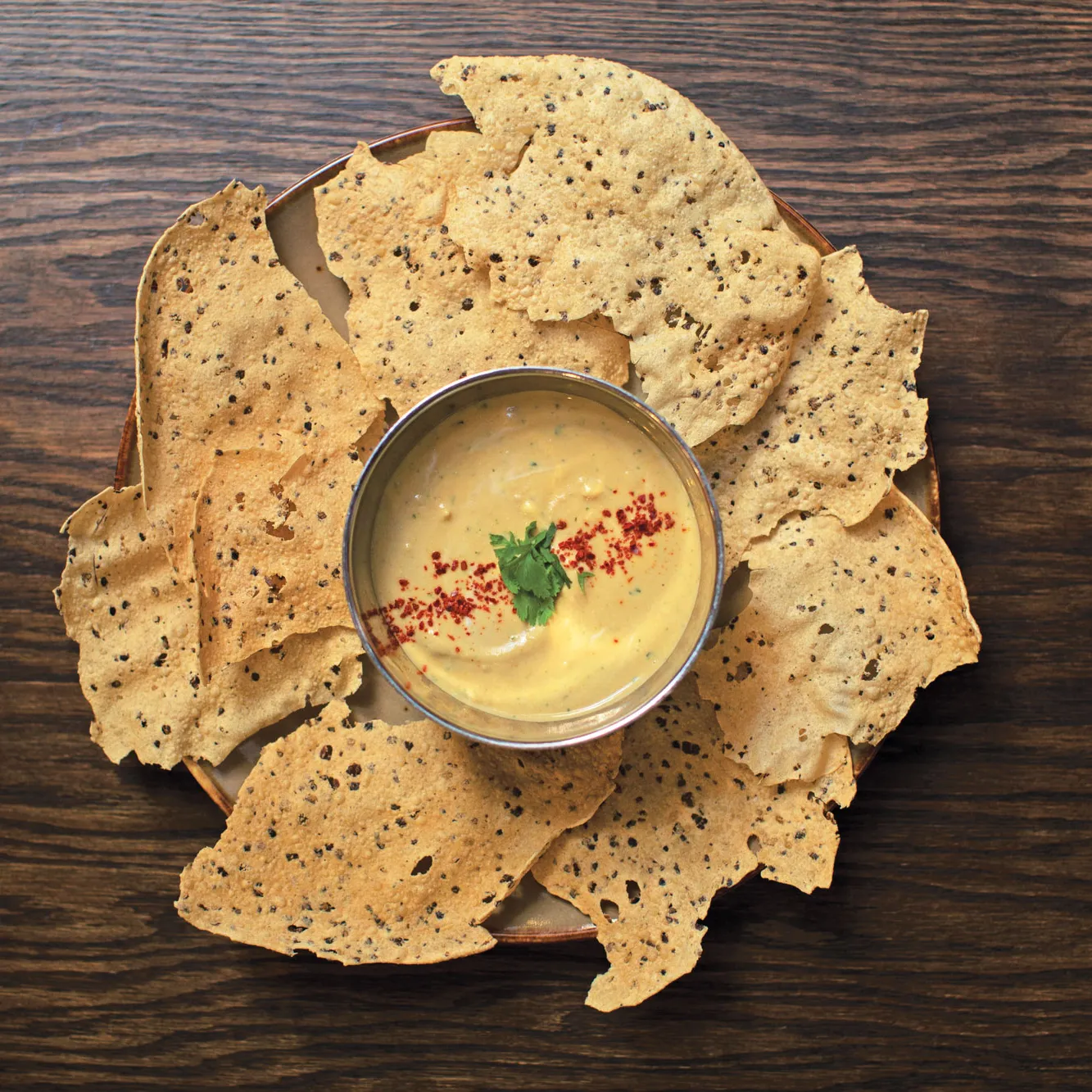 Paper thin crispy chick peas roasted in the tandoor served with chutney (vegan)