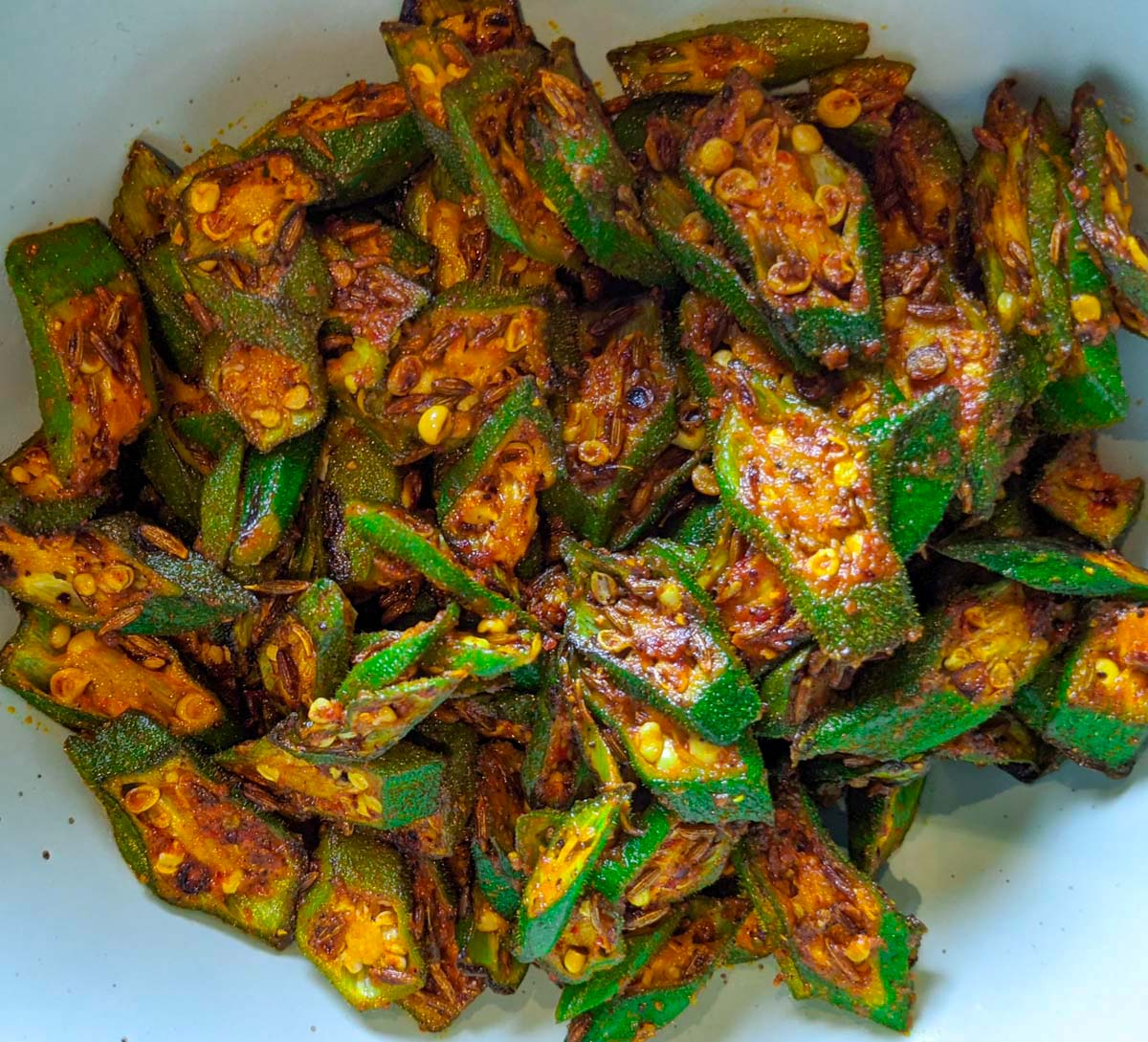 Fresh okra cooked in tomato, onions & green bellpeppers with exotics spices (vegan)