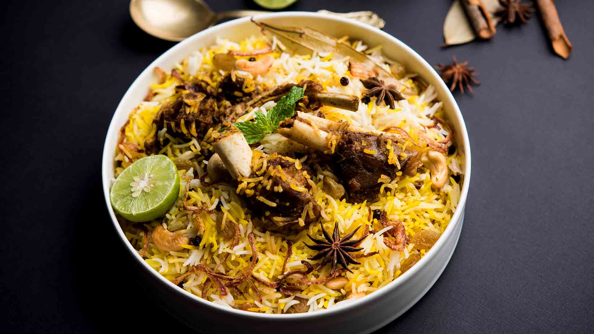 Basmati rice cooked with lamb cubes green peas, nuts and raisins