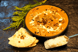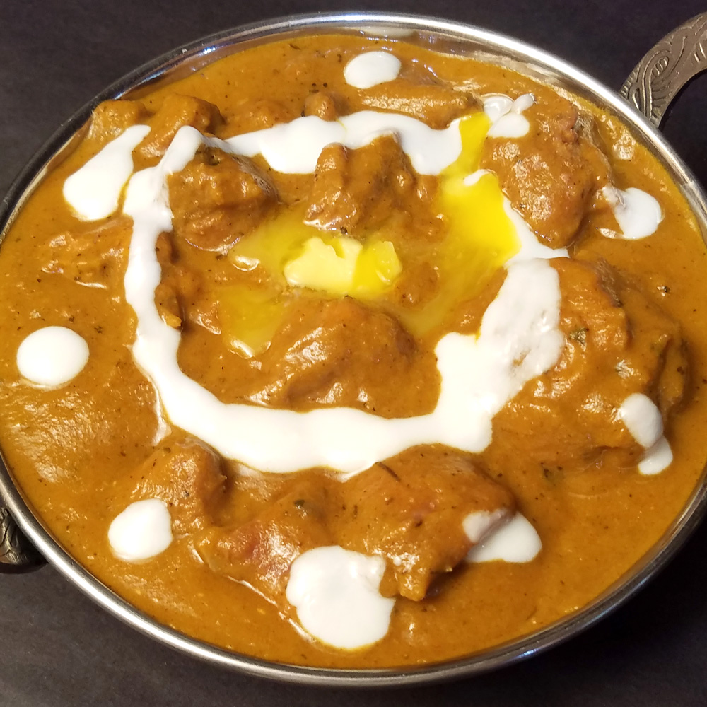 Boneless pieces of chicken breast in cream, butter sauce and Indian spices