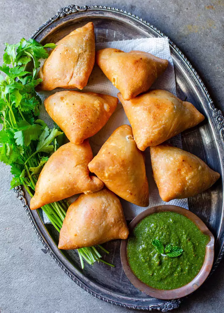 Friend pastry stuffed with potatoes and greem pegs served with chutney