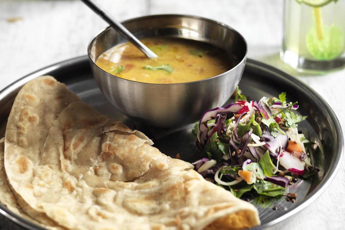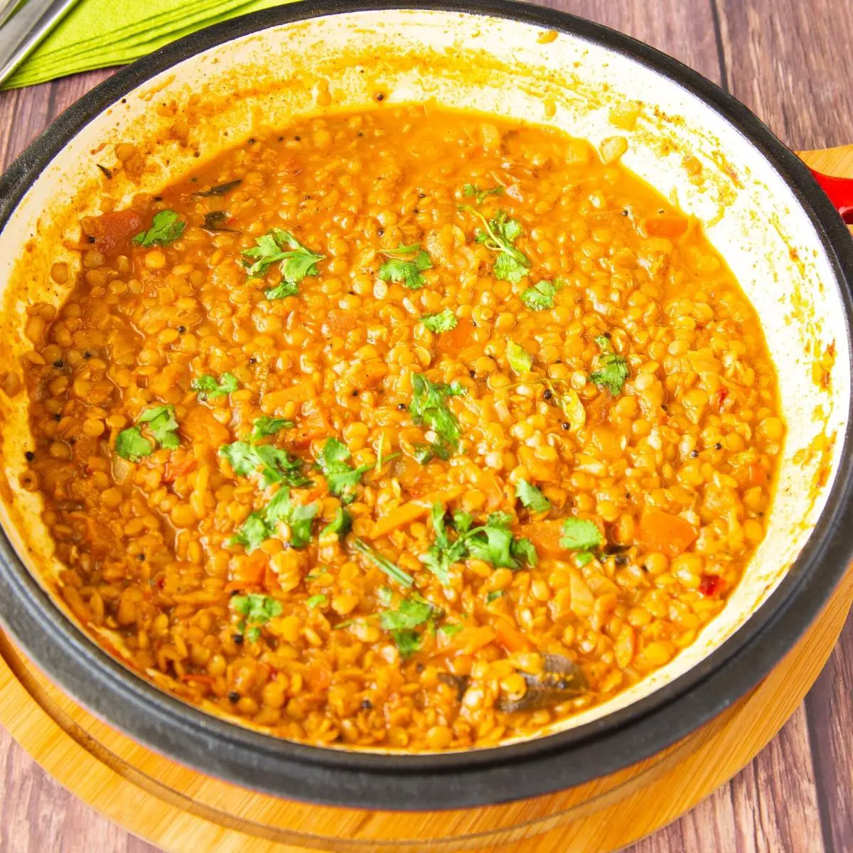 Yellow lentils tempered with cumin, onion & tomatoes with a touch of fresh cilantro (vegan)