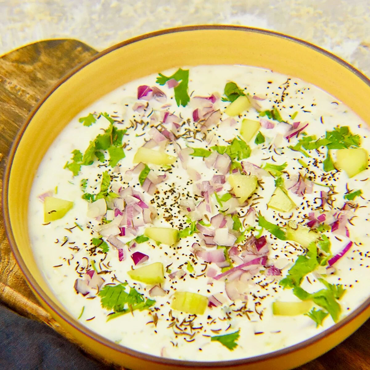 Refreshing homemade yogurt with groted cucumber, carrots and cilantro